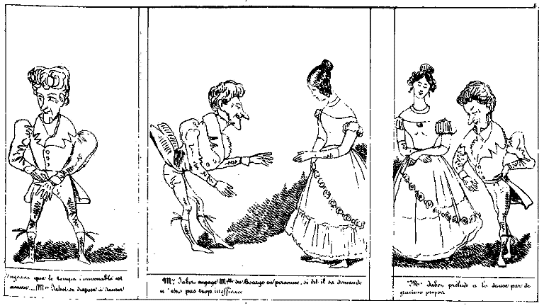 | Les propos étant peu goûtés, Mr. Jabot croit devoir approprier des gestes de bon goût à ses expressions choisies. | Les expressions ayant peu d'effet, Mr Jabot croit devoir se renfermer dans une attitude décélant l'observation fine et la plaisanterie de bon ton. | Après quoi, Mr Jabot conduit la galope avec le plus heureux succès. |