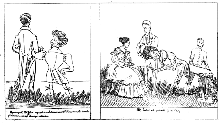 | Malheureusement Mr. Jabot termine son dernier entrechat sur le pied droit de Mme Josomby, sa danseuse, qui prend mal. | Mr. Josomby prend mal la chose. -- Il montre la porte à Mr. Jabot qui croit devoir lui demander satisfaction pour demain à 11 heures. |