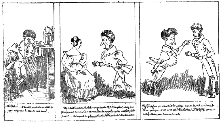 | qui exprime l'état de son âme. | Mot très heureux. Mr. Jabot est présenté à Mlle Plouplou, indigène d'infiniment d'esprit. -- Et c'est vous, Monsieur, que le galop a si fort mal traité? -- De la part des galopins, Mademoiselle, on peut s'attendre à tout. | Mr. Plouplou qui a conduit la galope, trouve le mot très impoli. -- Les galopins, c'est vous petit Brimborion! -- Mr Jabot demande satisfaction pour demain à midi. |