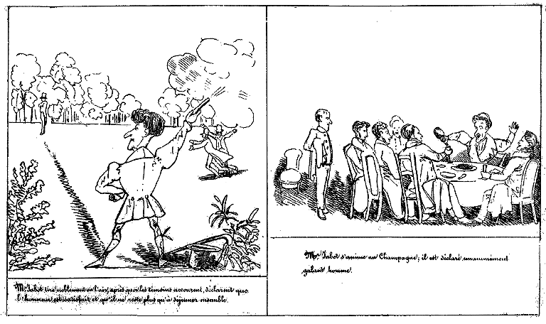 | Mr. Jabot tire noblement en l'air, après quoi les témoins accourent, déclarent que l'honneur est satisfait et qu'il ne reste plus qu'à déjeuner ensemble. | Mr. Jabot s'anime au Champagne; il est déclaré unaniment galant homme. |
