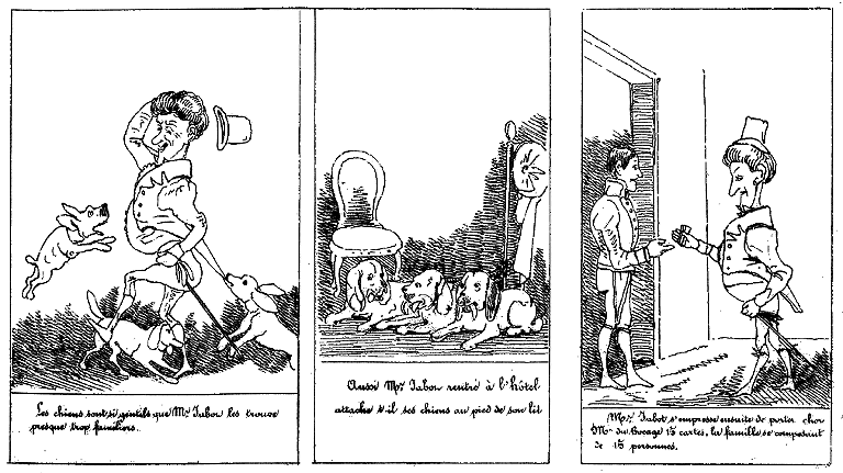 | Les chiens sont si gentils que Mr. Jabot les trouve presque trop familiers. | Aussi Mr. Jabot rentré à l'hôtel attache-t-il ses chiens au pied de son lit. | Mr. Jabot s'empresse ensuite de porter chez Mr. du Bocage 15 cartes, la famille se composant de 15 personnes. |