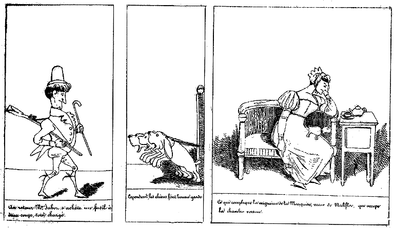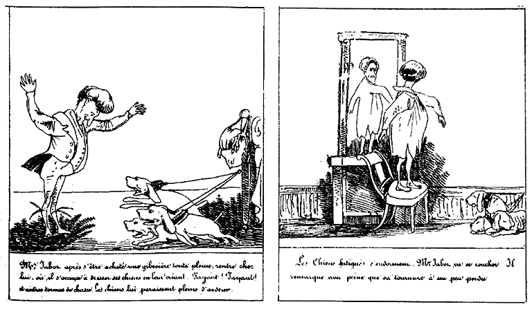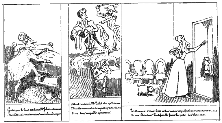 | Guidé par le bruit des chiens, Mr. Jabot retourne à son lit, ravi d'une aventure aussi chevaleresque. | S'étant rendormi, Mr. Jabot rêve qu'il sauve deux beautés mourantes des injustes persécutions d'un trop coupable oppresseur. | La Marquise s'étant levée de bon matin est profondément attendrie à la vue de son libérateur. Toutefois elle ferme la porte. Son chien aussi. |