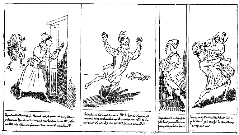 | Mais la marquise comprenant qu'on lui sauve la vie, retourne à son lit profondément touchée. | Cependant les chiens accourant au bruit ramènent le lit dans la chambre de Mr. Jabot. | Mr. Jabot poussé par une indignation galante, croit devoir jeter le voleur par la fenêtre qu'il croit être celle de la Marquise. | Heureusement qu'elle donne sur une galerie. L'aubergiste va quérir le magistrat. |