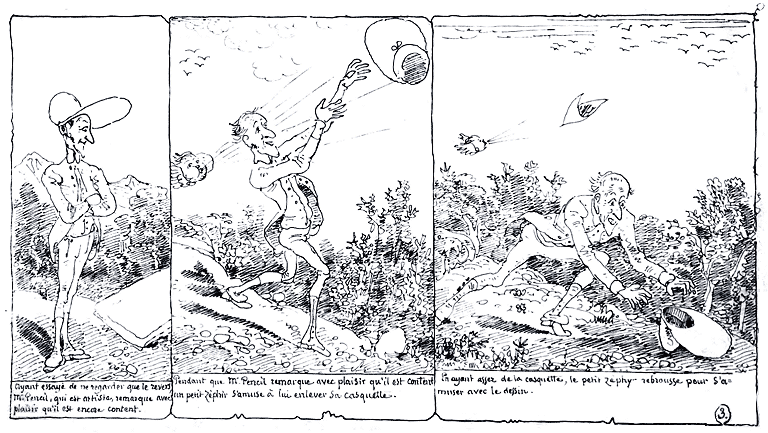 | Cependant le petit zéphir rencontrant le nouveau dessin de Mr. Pencil s'amuse à le faire voltiger. | Mr. Pencil ne voulant pas céder son dessin, se trouve avoir affaire au petit zéphir. | Mr. Pencil essaie de se retenir au chapeau d'un particulier. |