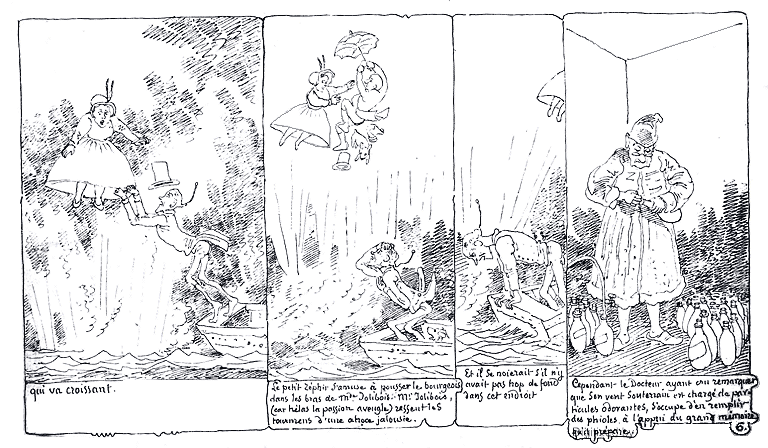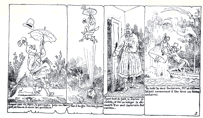 | En ayant assez du dessin, le petit zéphir passe au Bourgeois, et s'amuse à ouvrir son parapluie! | Puis il souffle d'en bas, ferme. | Ayant senti du froid, le Docteur se rhabille, et s'en va rédiger sa découverte d'un vent souterrain tout nouveau. | Par suite du vent souterrain, Mr. et Madame Jolibois commencent à être dans un sérieux embarras |