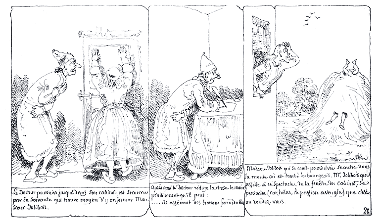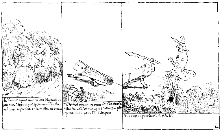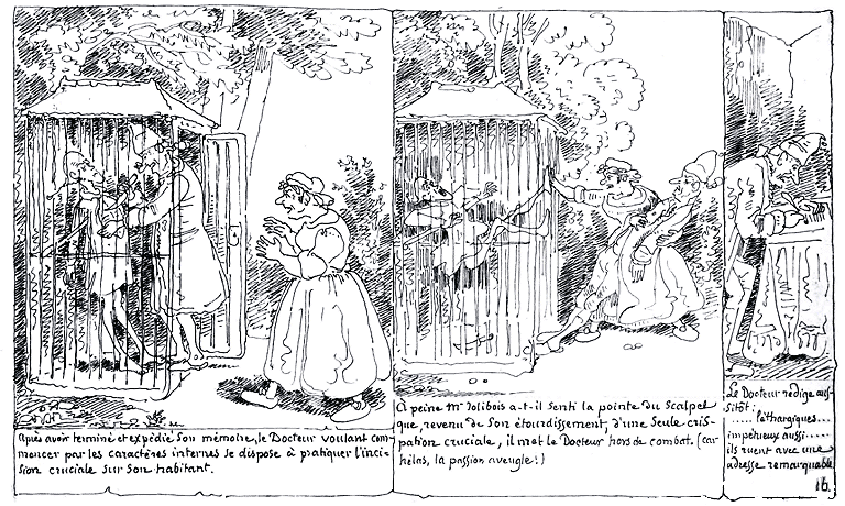 | Madame Jolibois ayant crié: Au secours!!.... le Docteur quitte la rédaction pour l'observation. Il examine l'effet produit par la vue d'une dame de notre globe sur un habitant de Psyché; et il note dans son esprit les plus petites circonstances. | Le Docteur rédige. | La Science étant satisfaite, le Docteur juge bon d'aller délivrer Mde. Jolibois; mais Mr. Jolibois juge mauvais qu'on se mêle de ses affaires, (car hélas la passion aveugle) et il tourne sa fureur contre le Docteur. Made. Jolibois profite du quart d'heure pour s'enfuir. |