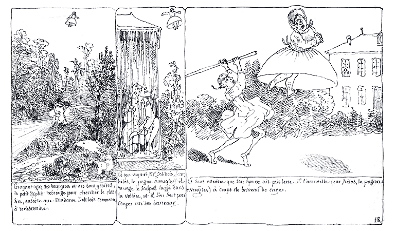 | En ayant assez des bourgeois et des bourgeoises, le petit zéphir rebrousse pour chercher le dessin, en sorte que Madame Jolibois commence à redescendre. | Ce que voyant, Mr. Jolibois, (car hélas, la passion aveugle) il ramasse le scalpel laissé dans la volière, et il s'en sert pour couper un des barreaux. | Et sans attendre que son épouse ait pris terre, il l'accueille (car hélas la passion aveugle,) à coup de barreau de cage. |