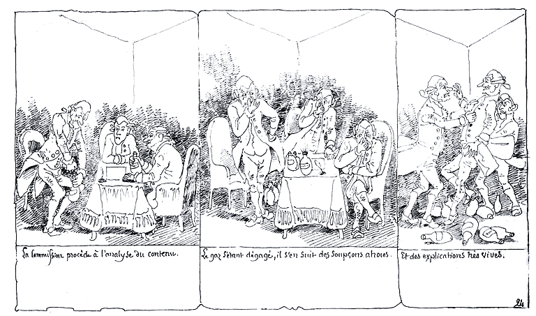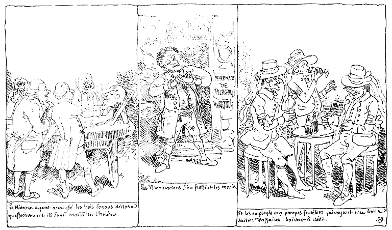 | La médecine ayant analysé les trois savants déclare qu'effectivement ils sont morts du Choléra. | Les Pharmaciens s'en frottent les mains. | Et les employés aux pompes funèbres prévoyant une belle saison d'affaires boivent à crédit. |