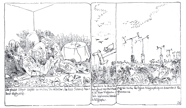 | Les phioles s'étant cassées au milieu du désordre, les trois savants tombent asphyxiés. | Cependant le chien du bourgeois en cherchant à se tirer d'affaire fait légèrement basculer le télégraphe. | Aussitôt toutes les lignes télégraphiques basculent légèrement. |
