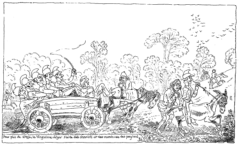 Pour plus de vitesse, le Vingtième-léger s'aide des chariots et des montures des paysans.