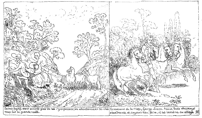 | Les trois fugitifs étant arrivés près du bois s'y enfoncent en abandonnant les chevaux sur la grande route. | En revenant de la messe, George Luçon trouve trois chevaux abandonnés et, croyant bien faire, il les ramène au village. |
