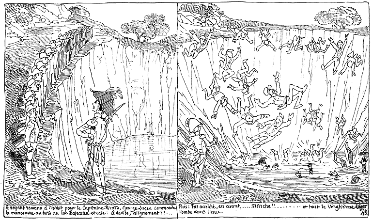| Se voyant reconnu à l'habit pour le Capitaine Ricard, George Luçon commande la manoeuvre au bord du lac Batracien et crie: A droite, alignement!!... | Puis: Pas accéléré, en avant,.... marche!!..... et tout le Vingtième-léger tombe dans l'eau. |
