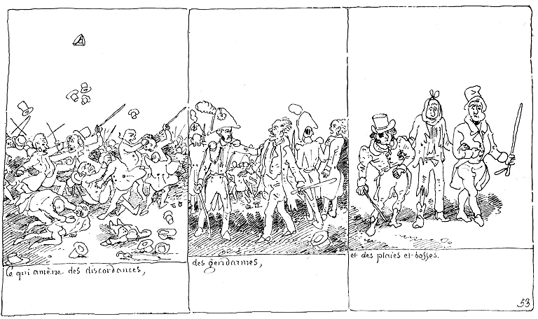 | Cependant Mr. Pencil et Mde. Jolibois arrivant au même lieu, la même invitation leur est faite. Mr. Pencil répond qu'il s'est purgé en route; et Mde. Jolibois qu'elle ne se purge jamais. Ce qui fait rire l'officier sanitaire, homme de beaucoup d'esprit. | Les effets du Docteur sont fumigés. Mr. Jolibois (car hélas la passion aveugle) y voit la continuation du complot tramé par sa femme et les deux vils séducteurs, et il suffoque de jalousie. | Les ais de la caisse ayant cédé, les deux valets de santé n'ont que le temps de crier: au Choléra!... au Choléra!!! |