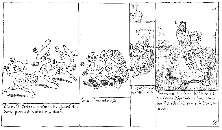 | A la vue du Choléra en personnes les officiers de santé prennent le mors aux dents. | Et les infirmiers aussi. | Et les infirmières pareillement. | Heureusement la servante s'aperçoit que c'est le Psychiote de son maître qui s'est échappé, et elle l'a bientôt repris. |