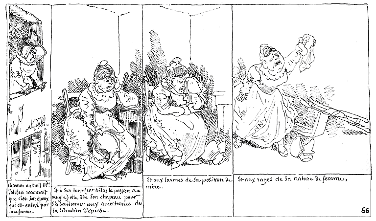 | Accourue au bruit Mde. Jolibois reconnaît que c'est son époux que est enlevé par une femme. | Et à son tour (car hélas la passion aveugle) elle ôte son chapeau pour s'abandonner aux amertumes de sa situation d'épouse. | Et aux larmes de sa position de mère. | Et aux rages de sa nature de femme. |