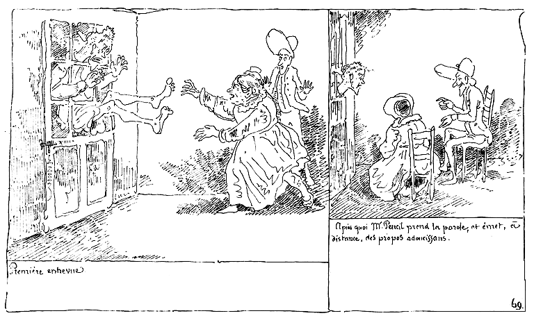 | Le Docteur poursuivi jusque dans son cabinet est secouru par sa servante qui trouve moyen d'y enfermer Monsieur Jolibois. | Après quoi le Docteur rédige la chose le moins péniblement qu'il le peut: ... ils assènent des horions formidables. | Madame Jolibois qui se croit poursuivie se cache dans la meule où est tombé le bourgeois. Mr. Jolibois qui assiste à ce spectacle, de la fenêtre du cabinet, se persuade (car hélas, la passion aveugle) que c'est un rendez-vous. |