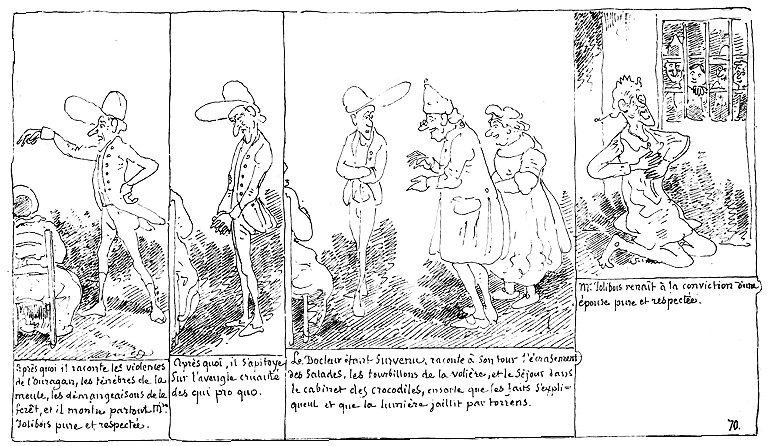 | Après quoi il raconte les violences de l'ouragan, les ténèbres de la meule, les démangeaisons de la forêt, et il montre partout Mde. Jolibois pure et respectée. | Après quoi, il s'apitoie sur l'aveugle cruauté des qui pro quo. | Le Docteur étant survenu, raconte à son tour l'écrasement des salades, les tourbillons de la volières, et le séjour dans le cabinet des crocodiles, en sorte que les faits s'expliquent et que la lumière jaillit par torrents. | Mr. Jolibois renaît à la conviction d'une épouse pure et respectée. |
