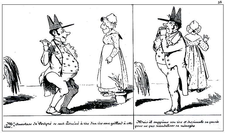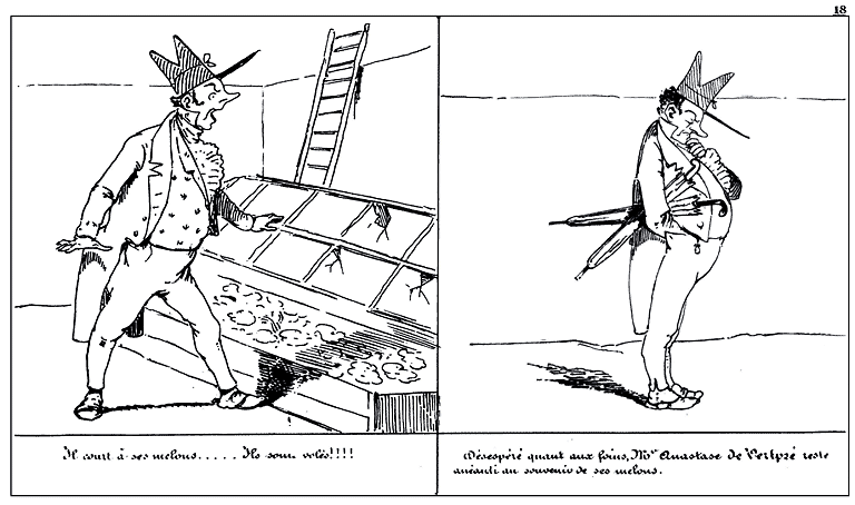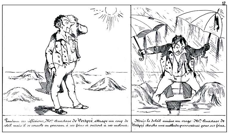 | Déchiré par ses tortures physiques et morales, Mr. Anastase de Vertpré juge à propos de s'appliquer un emplâtre. | Effet de l'emplâtre. |
