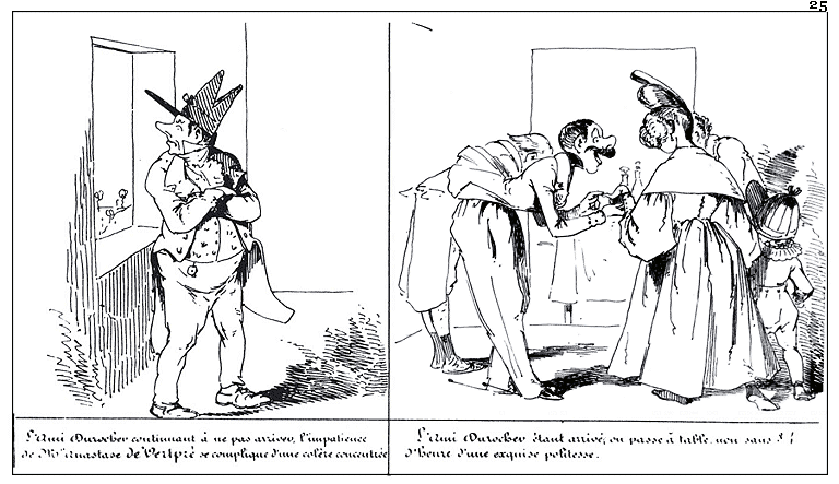 | L'Ami Durocher continuant à ne pas arriver, l'impatience de Mr. Anastase de Vertpré se complique d'une colère concentrée. | L'Ami Durocher étant arrivé, on passe à table non sans 3/4 d'heure d'une exquise politesse. |