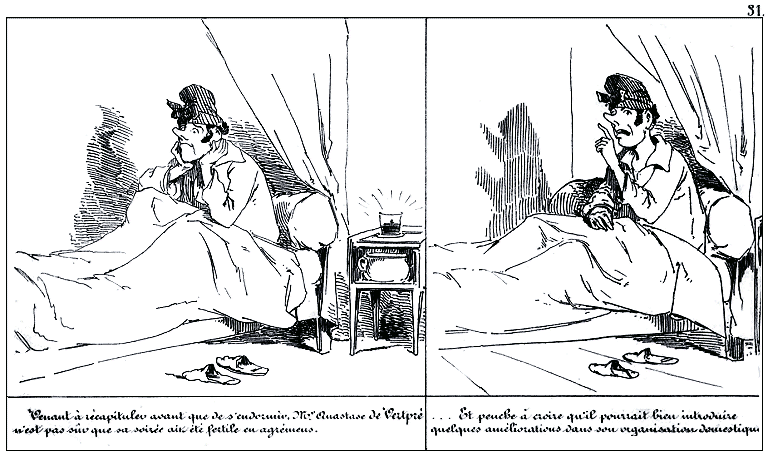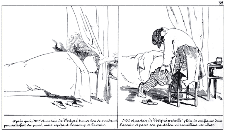 | Après quoi, Mr. Anastase de Vertpré trouve bon de s'endormir peu satisfait du passé, mais espérant beaucoup de l'avenir. | Mr. Anastase de Vertpré se réveille plein de confiance dans l'avenir, et passe son pantalon en recueillant ses idées. |