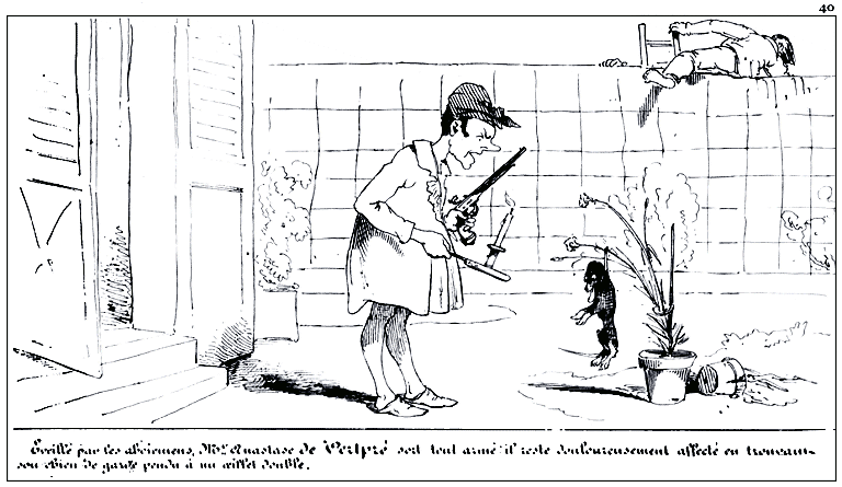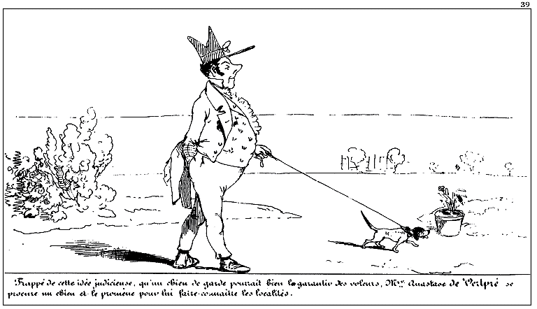 Frappé de cette idée judicieuse, qu'un chien de garde pourrait bien le garantir des voleurs, Mr. Anastase de Vertpré se procure un chien et le promène pour lui faire connaître les localités.