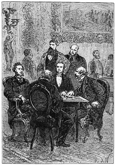 Les cinq collègues se regardaient. On peut croire que les battements de leur cœur avaient subi une légère accélération, car enfin, même pour de beaux joueurs, la partie était forte! Mais ils n'en voulaient rien laisser paraître, car, sur la proposition de Samuel Fallentin, ils prirent place à une table de jeu.