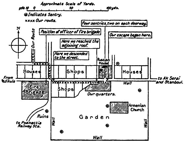 We had now reached the middle of the Seraskerat and saw that the side gate was shut, and sentry-guarded. There was also a sentry in the adjacent shed. The main gate was impossible of access. So also was the garage. Our only chance lay in going forward.